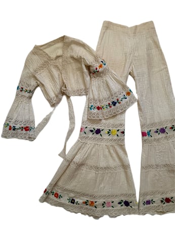 late 1960s Mexican hand embroidered pintucked cotton bellbottom trouser and crop top set