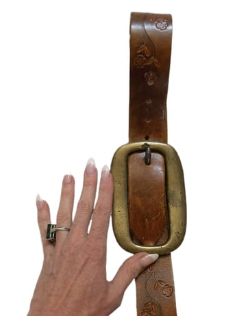 late 60s/early 1970s tooled leather belt with massive brass buckle