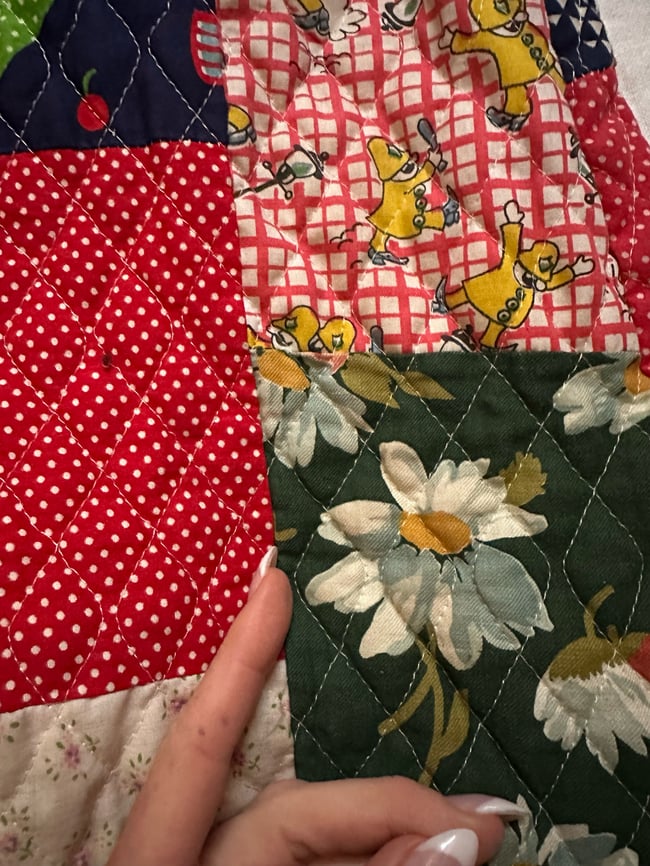 as is: typical surface wear. a few minor spot marks on arms and likely a pin hole or mark on patchwork i missed. stain spot by top button