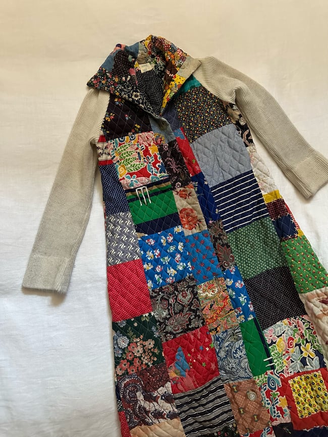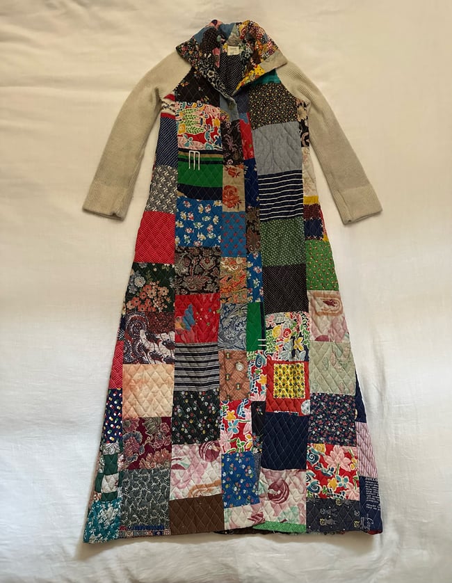 this is one amazing our e! the cutest patchwork fabrics and knit sleeves/ the sweetest 70s piece