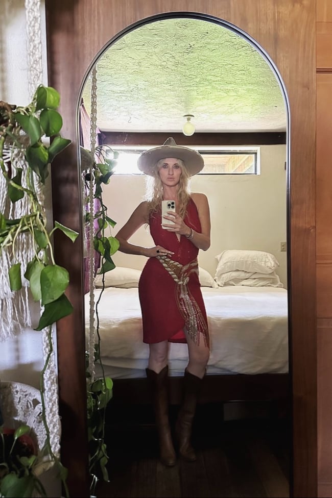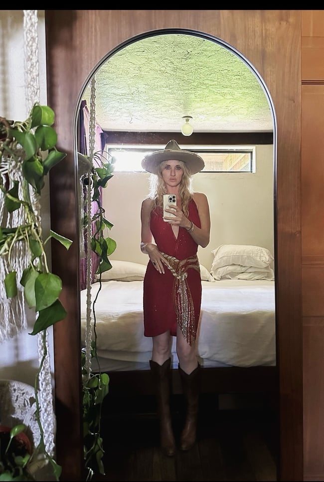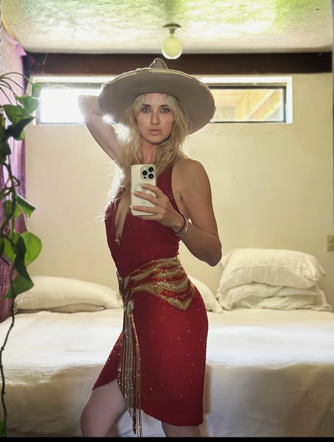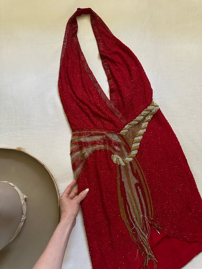 thisstunning plunging 70s trompe l'oeil silk silk beaded dress is a knockout.