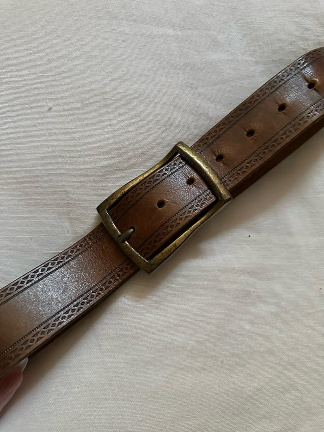 as is: lots of wear and scratching and patina to buckle. belt is soft with a few dings here and there. possibly a flaw i missed