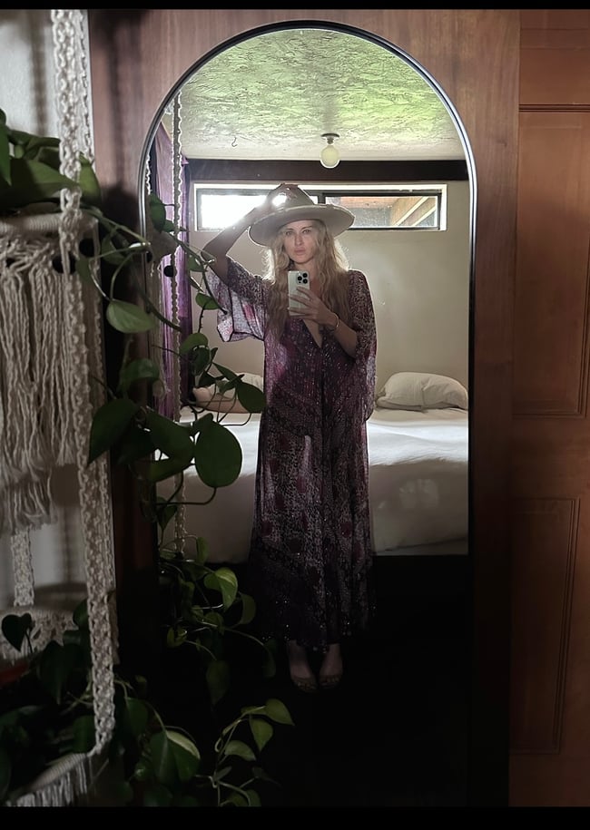 The holy grail of bohemian caftans without a doubt. Made famous by Kate Mss on the beaches of Ibiza, this dream piece us lighter than air and floats as you walk- Gorgeous vibrant colors and buttons on the chest so you can make it plunging too. Lovely angel sleeves. A rare gem.
