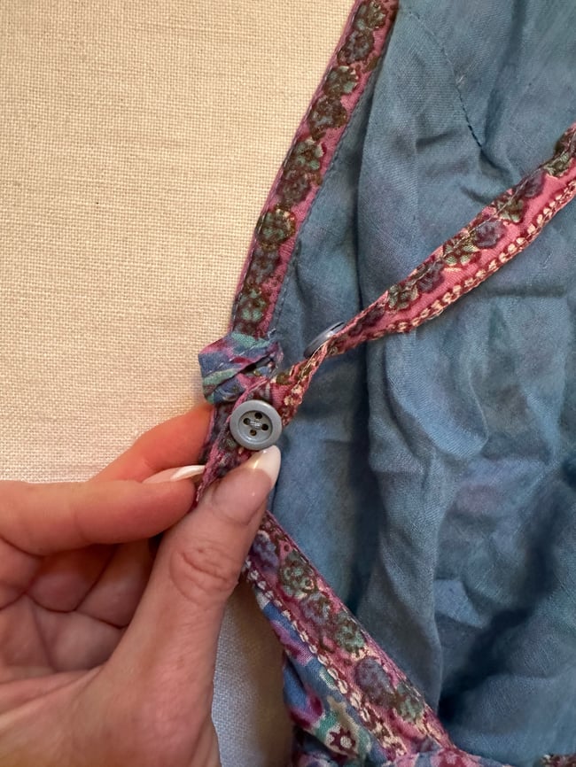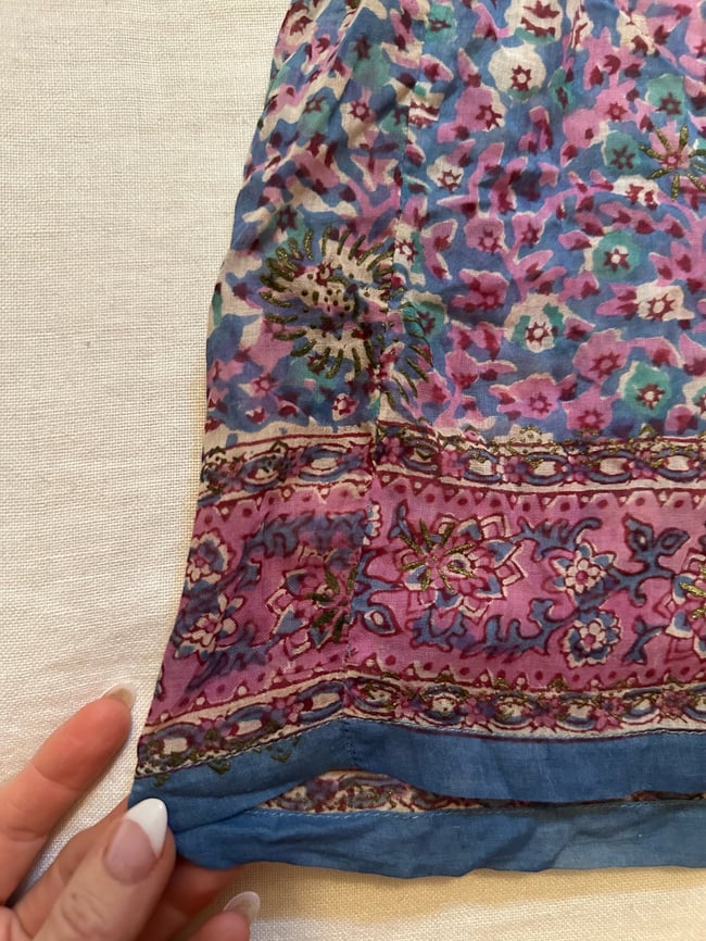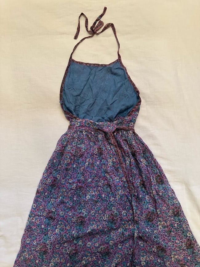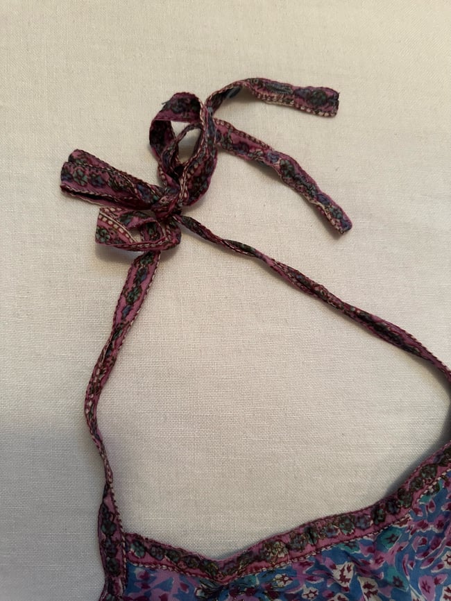 as is: untagged deadstock so you can still smell the ink from the hand blocked fabric which is pretty amazing. stored for over 45 years so possible a crease or mini mark or pin hole i missed. there are several ways you can tie the back- i think it's cutest ties like a halter with the back open but you can criss cross the straps too. possibly a flaw i missed