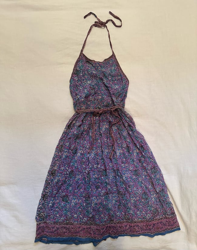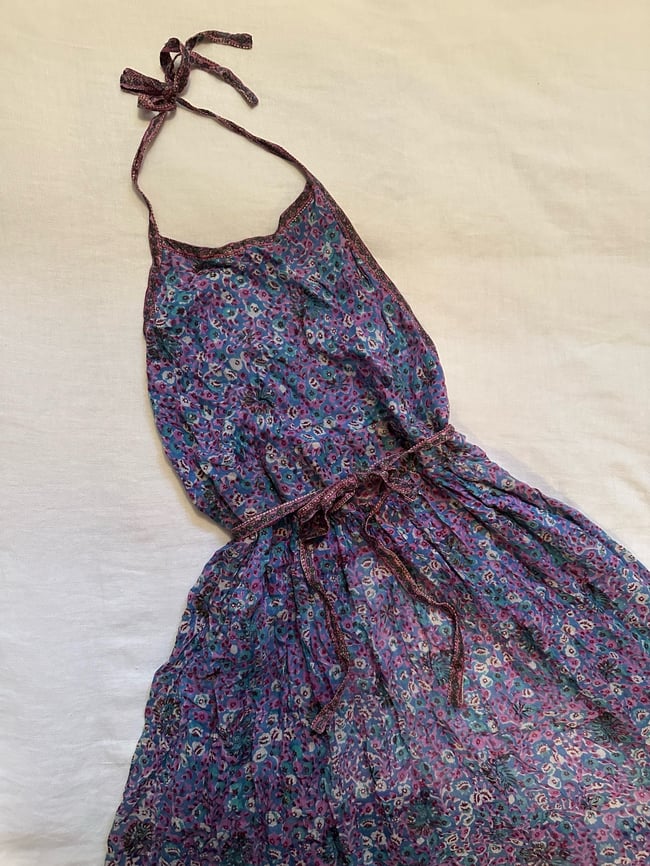 the MOST amazing late 1960s thin indian gauze wrap dress from my personal collection. can be worn criss-crossed in the back or tied as a halter. bodice is lined in a cotton gauze. ties wrap around and fasten by tying up to secure so you get a perfect fit.