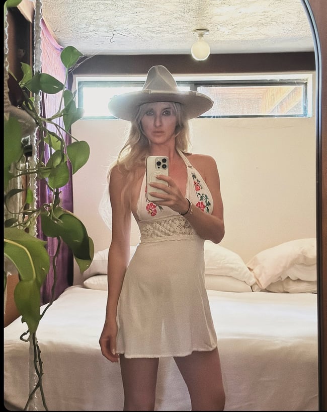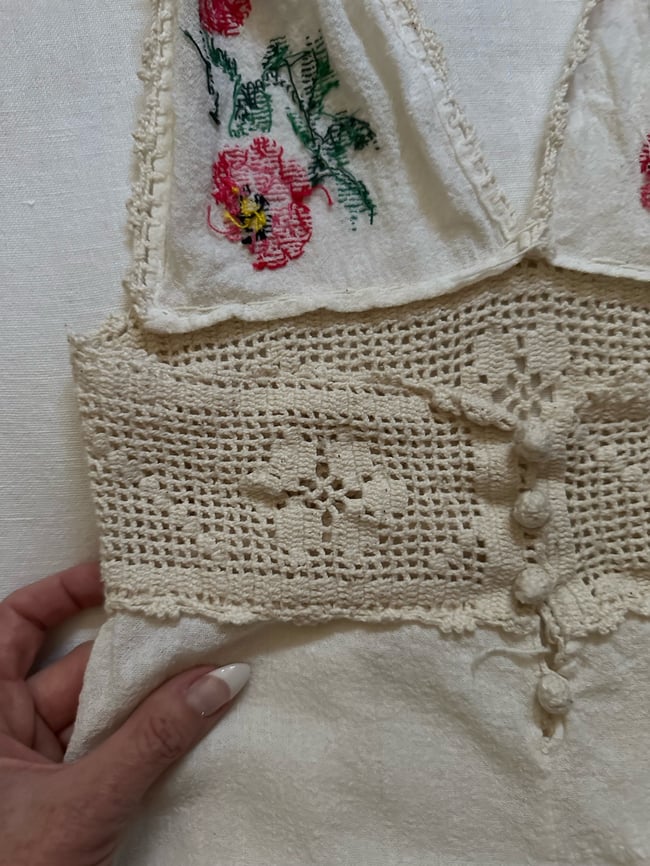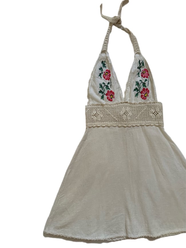 the sweetest little light-as-air gauze halter mini. The hand cross-stitched embroidery is so killer and the crochet straps tie at back of neck for perfect fit. Crochet buttons fasten at the waist.